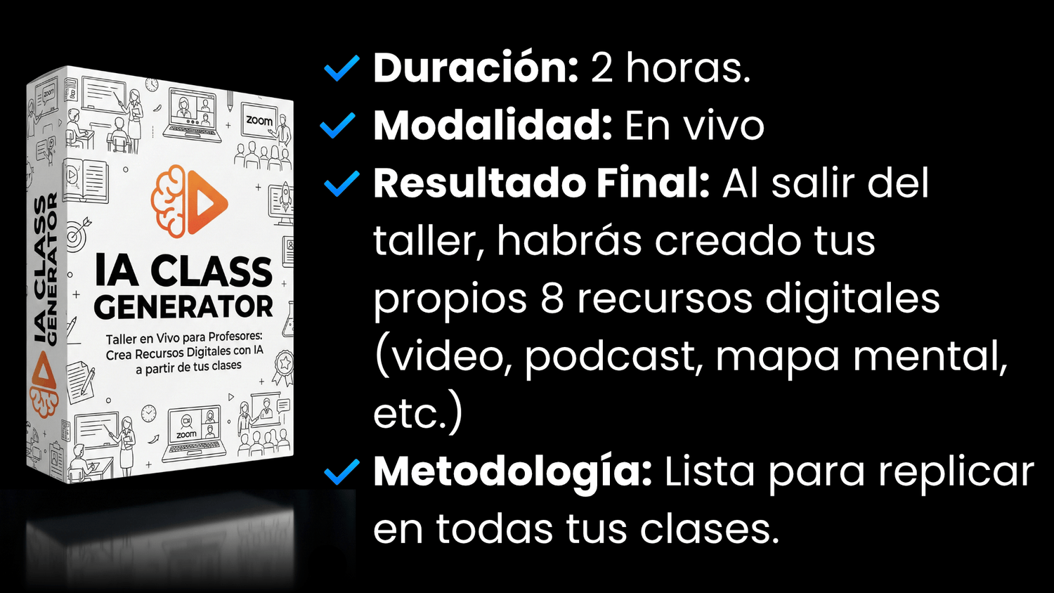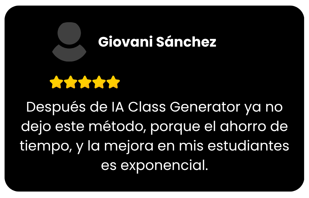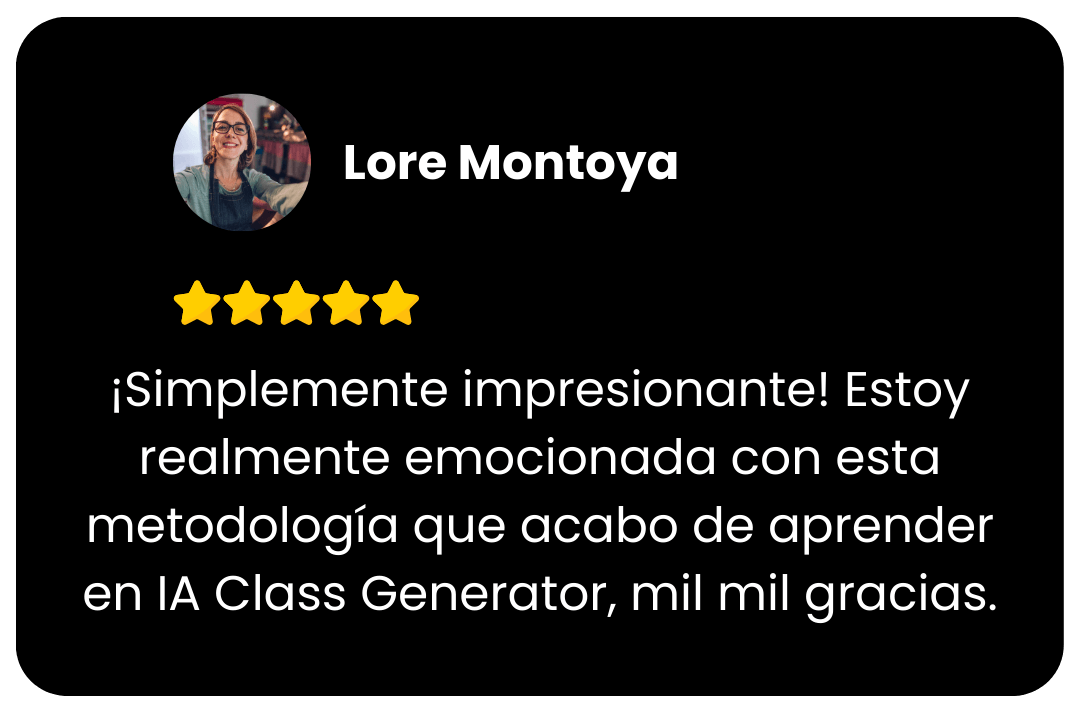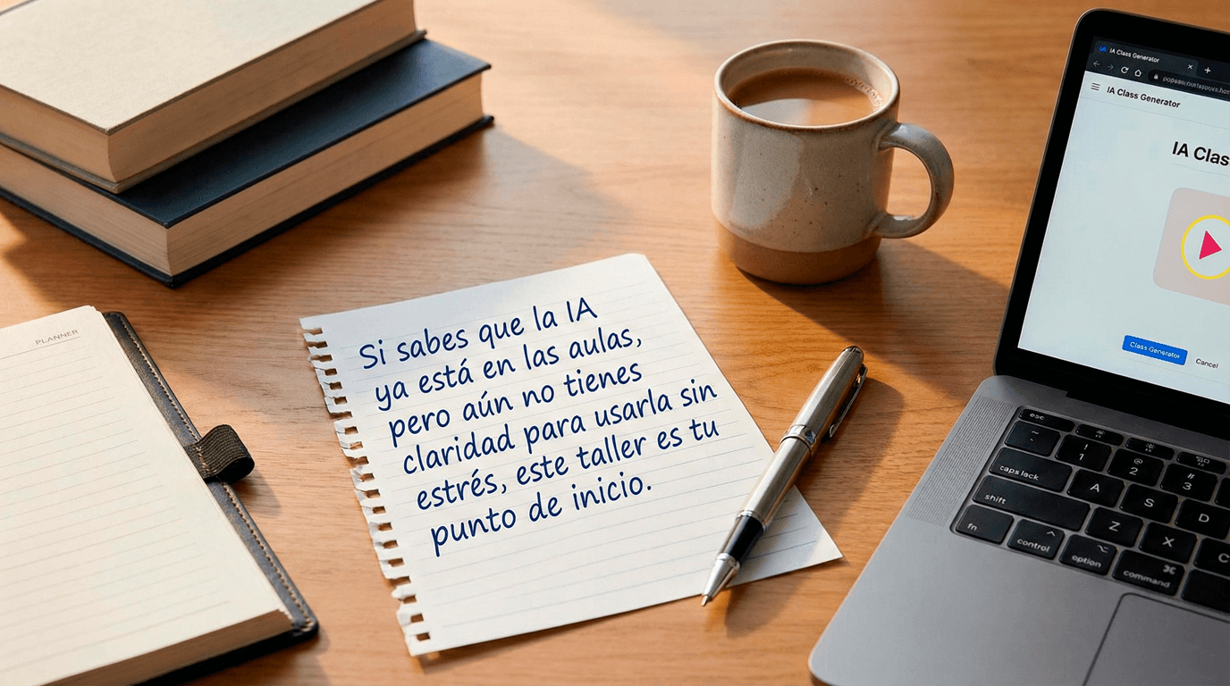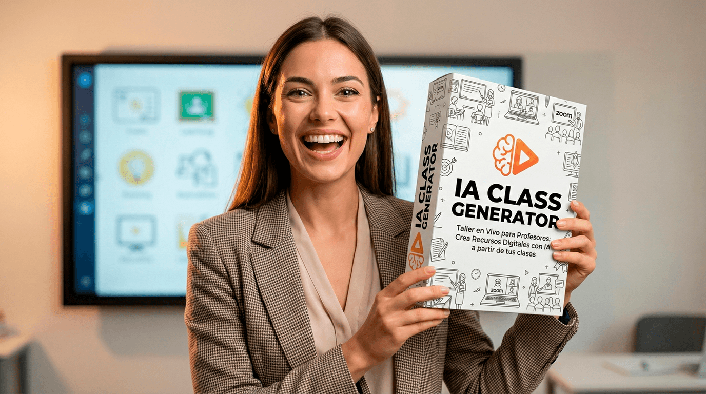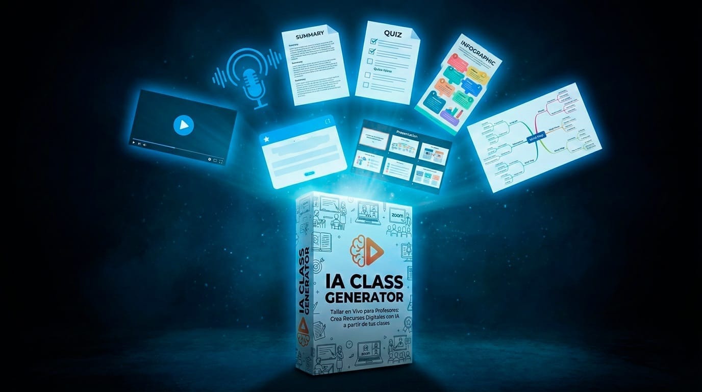 IA Class Generator es un taller online 100% en vivo donde aprenderás una metodología clara y aplicable para transformar tus clases en recursos, con Inteligencia Artificial.